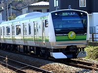 少し寒かったが快晴だった。つくし野駅から東急長津田検車区まで歩いた。途中の横浜線の踏切で、画像左の、八王子行きの車両を撮った。ヘッドマークのある車両が2編成あるその1両にであった。しかも、1時間後に、この車両の帰りにも会うことができた。珍事です!