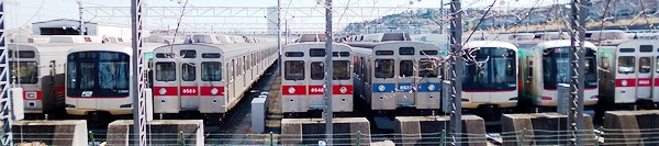 上の画像は、長津田検車区の東急車両です。昔の車両、前の車両、現在の車両、と多くの車両が並んでいます。無論すべて現役で使われています。朝のラッシュ時間が過ぎたので、休息の時間です。