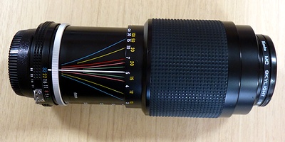 また、これらのレンズは、現在の1眼レフカメラにも使えますが、自動焦点は作動しません。左:200mm望遠レンズ。右:55mmマクロレンズ。