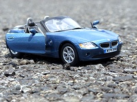 画像は、手のひらに乗るサイズの模型のオープンカーの車のドアを開け、駐車場の地面に置いて撮影したものです。雨が降っても水がすぐ浸透する構造のアスファルト舗装の駐車場で、拡大すると岩場のように見えます。コンパクトデジカメで撮っていますが、手前と遠景がぼけています。ピンとは車の手前の地面のようですね。そのほかには花なども撮って楽しみました。