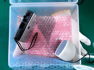 パソコンの出力にスピーカーをつなぎ、録音機と共に、箱に入れます。