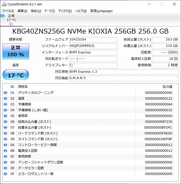 Cドライブは、M.2 NVMe 接続の 256GB です