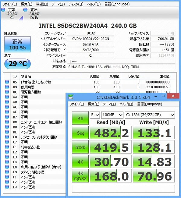 Crucialと比べると、残念な数値です。使用時間は1134時間です。
