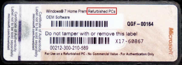 これを見ると、再生パソコンとして、正規のOSがインストールしてあるもののようです。 インストールしてあったのは、Windows 7 32ビットです。 再生パソコンとはMicrosoft Authorized Refurbisher(MAR)プログラムを活用した再生パソコンで、 OSの入ってない中古パソコンに正規WINDOWS OS をインストールして販売する、新しい中古パソコンです。 この機にはプロダクトキーラベルがありません。