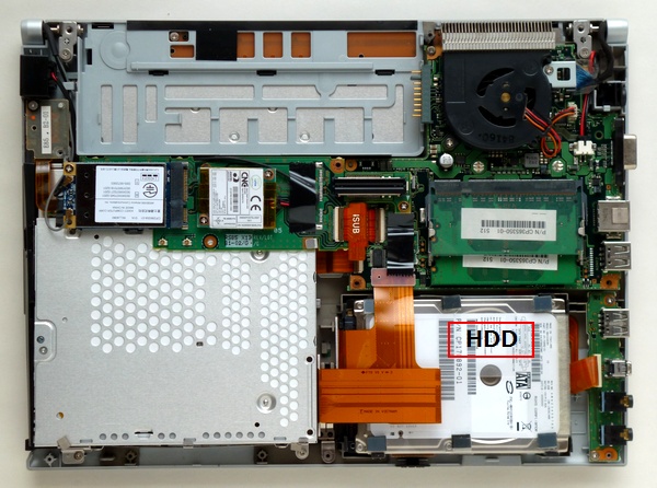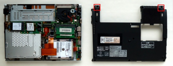 分解してHDDを交換してOSをインストールします。ドライバーが不足しているとうまくインストールできないので調べます。分解は裏側のタッピングビス8本と、赤枠のビス2本の計10本で固定されています。VGAコネクターを枠に固定している2.6Φ のナットを外します。裏蓋のDVD側を浮かし、音声の入出力コネクターがはめ込まれているので注意して右にずらします。