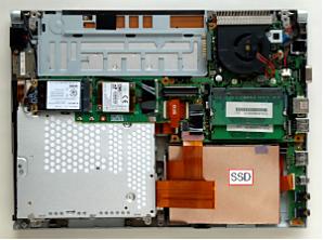 右図:交換するSSDは、裸の状態なので絶縁を考え、ボール紙で封筒様のものを作り その中に入れます。SSDをコネクターにつないでから、右から封筒を差し込み絶縁します。 メモリーも1GBから1.5GBになり、操作が軽快になりました。