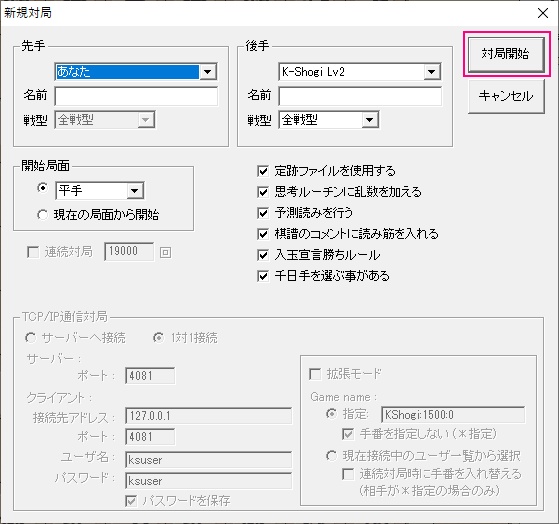 新規対局画面右上の 「対局開始」をクリックすると対局ができます。