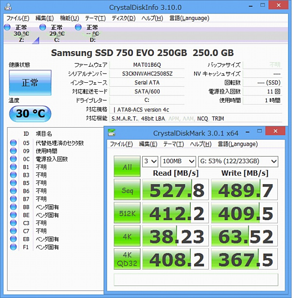 その後、このSSDは、データドライブとして、ポート2に接続され、ポートの転送モードはSATA/300 となり、転送速度は左図のように変わりました。ポート1に変更しても速度は同じでした。
