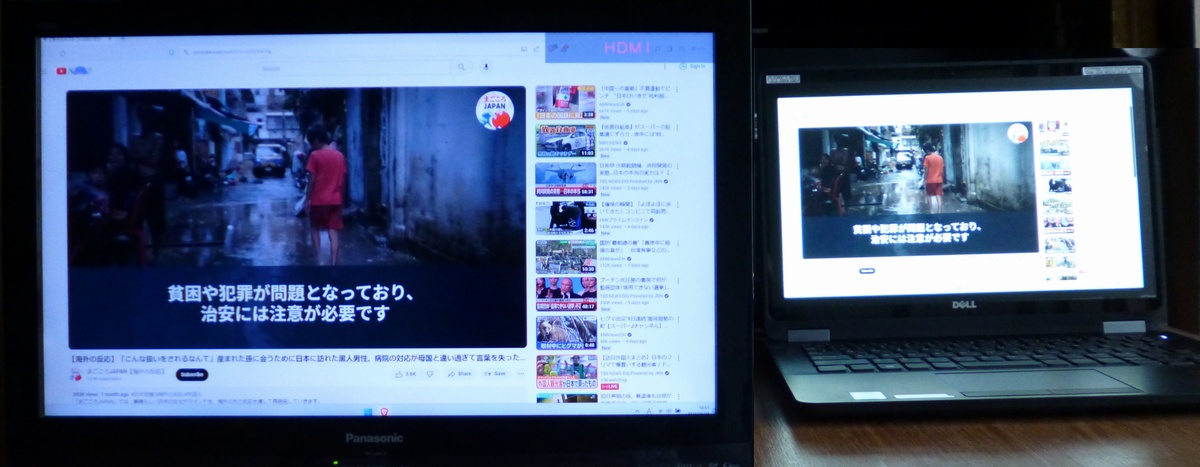 パソコン 12.5吋(右)と液晶 24型 TV(左)を HDMI ケーブルで接続。