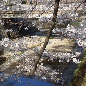 川面に下がる桜。、 成瀬中央橋から下流右岸を眺めます。