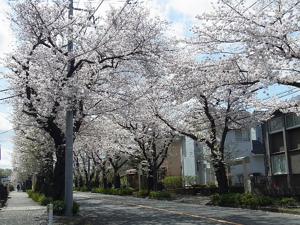 画像右下の「つくし野駅」から、画像左上のガソリンスタンド前の「高瀬橋」バス停まで約4km、ゆっくり歩いて、1時間15分です。 残念ながら、つくし野駅からつくし野郵便局までの桜は、大木になり危険なので切り倒されています。郵便局から吹上橋まで、 ずーと桜並木です。満開を過ぎると花弁が歩道に散り風情があります。