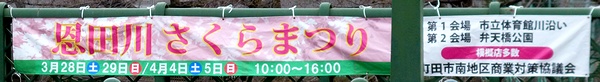成瀬中央橋の横断幕には、恩田川さくらまつりは、3月28日(土)~29日(日)と、4月4日(土)~5日(日)と、記載があります。