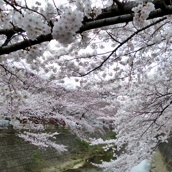 会下山橋の下の歩道橋の左端の桜です。毎年、1番先に咲きます。