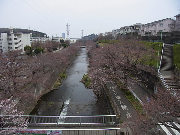 恩田川の岸辺には、少し花びらが散っています。