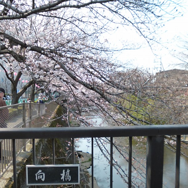 都橋から下流を眺める。都橋の頭上は、はぼ満開。